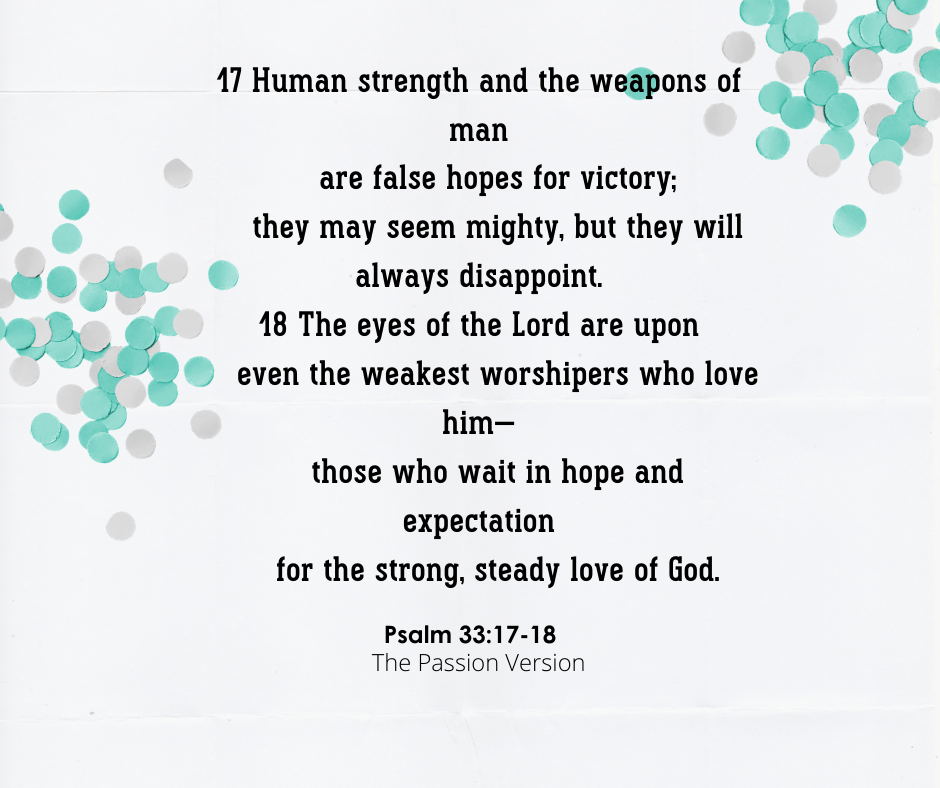 Jesus is EVERYTHING to this younger friend of mine. I have watched her walk through years of waiting when there seemed (from the human eye) to be no hope. Yet, she believed God’s promises even when there was no tangible proof He was working. When others questioned her waiting and not taking worldly steps to get what she hoped for, she stood firm and waited on God. She believed He would do it . . . and He did! I’ve seen the answers to her prayers with my own eyes.